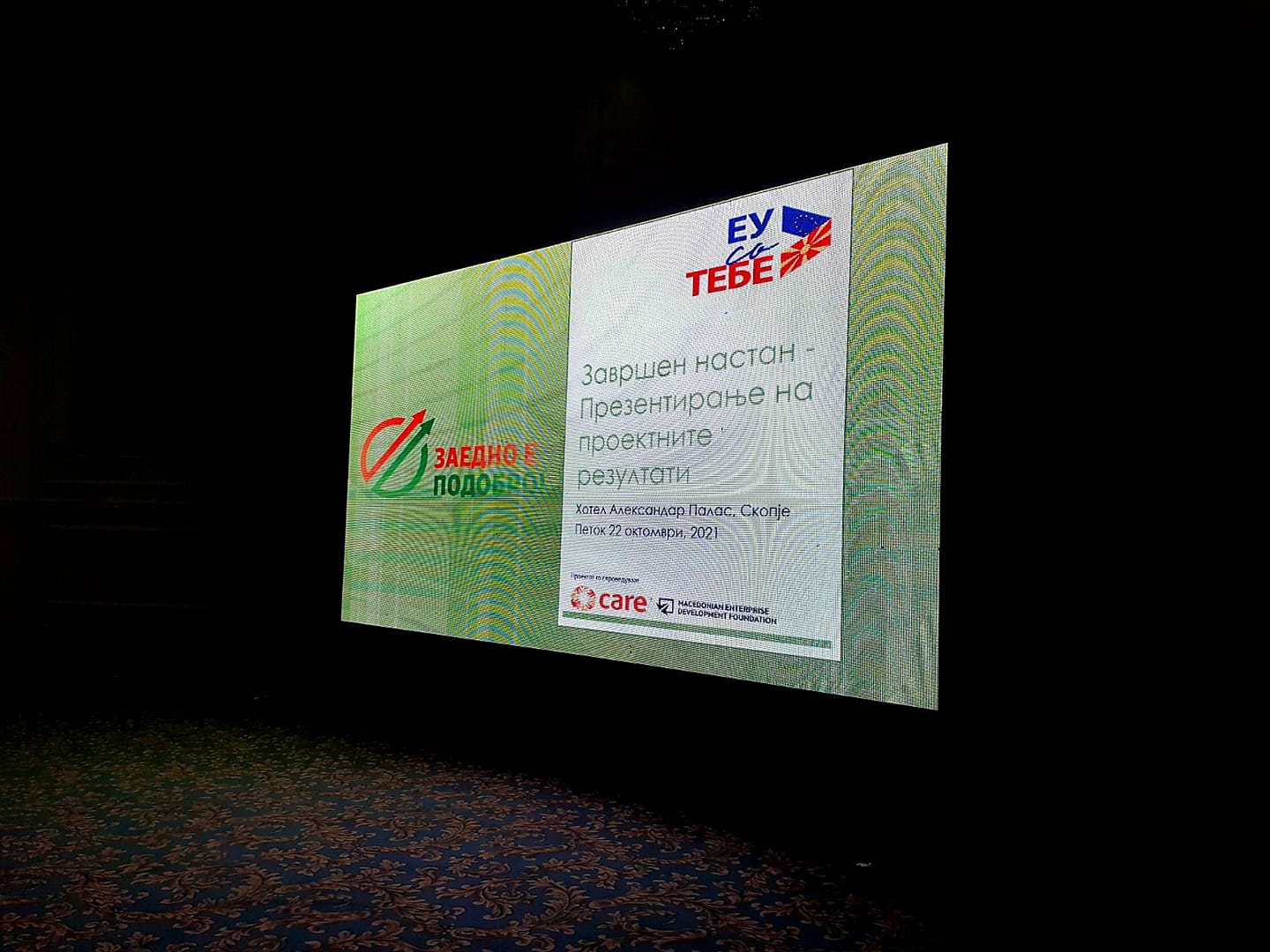 На 22 октомври во х. Александар Палас во Скопје се одржа завршната конференција на проектот „Поддршка за развој на земјоделски задруги“ финансиран од Европската унија а имплементиран од CARE International и Македонска развојна фондација за претпријатија. На конференцијата свое обраќање имаа: г -дин Аријанит Хоџа – министер, Министерство за земјоделство, шумарство и водостопанство, г -дин Константинос Супилас – програмски менаџер на Европската Унија, г -ѓа Сумка Бучан – регионален директор на CARE Balkans, г -дин Лазар Неданоски -извршен директор на Македонската развојна фондација за претпријатија, Г-ѓа Сузана Димитриевска, претседател – Mакедонската асоцијација на земјоделски задруги и г-дин Драган Периќ – проектен менаџер во CARE. За време на настанот беа презентирани резултатите од проектот, како и успешни видео приказни на земјоделски задруги.
